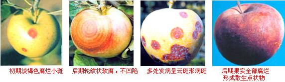主要危害果實,也可侵染枝干和果臺。自病斑中心剖開果實,可見果肉自果面向果心成漏斗狀變褐腐爛。病組織帶有苦味。病斑邊緣紫紅色或黑褐色,中央凹陷,斑上黑色小點稀疏,呈同心輪紋狀排列,其下果肉局部壞死。枝干發(fā)病與果實癥狀相似。