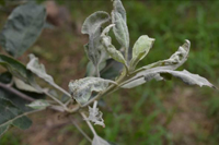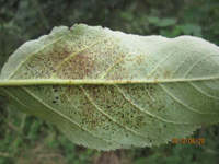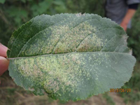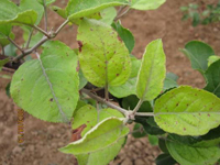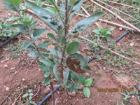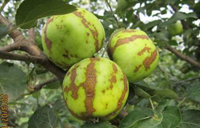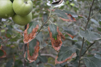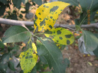 不同蘋果品種的感病性有明顯差異。高溫多雨,當氣溫在10-20℃,光照較強,癥狀較重。樹勢衰弱時,癥狀較重,幼樹比成株易發(fā)病。土壤干旱,水肥不足時發(fā)病重。