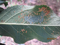 病菌在檜柏上為害小枝,即以茵絲體在菌癭中越冬。第二年春天形成褐色的冬孢子角。冬孢子柄被有膠質(zhì),遇降雨或空氣極潮濕的胺化膨大,冬孢子萌發(fā)產(chǎn)生大量擔孢子,隨風傳播到蘋果樹上。銹菌侵染蘋果樹葉片、葉柄、果實及當年新梢等,發(fā)病期持續(xù)一個月。