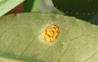 主要為害成熟或近成熟葉片。葉片染病葉背面現(xiàn)黃色、裸露的夏孢子堆,大小0.2—0.4mm,圓形至橢圓形,包被破裂后變?yōu)槌赛S色,后又褪為淺黃色,在與夏孢子堆對應(yīng)的葉正面現(xiàn)紅褐色斑塊,秋后又形成冬孢子堆,圓形,大小0.2—0.7mm,橙黃色至暗黃色,嚴重時孢子堆擴展至全葉。