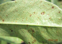 癥狀:花生銹病在各個生育階段都可發(fā)生,但以結(jié)莢期以后發(fā)生嚴重。主要侵染花生葉片,亦可為害葉柄、托葉、莖稈、果柄和莢果。葉片染病初在葉片正面或背面出現(xiàn)針尖大小淡黃色病斑,后擴大為淡紅色突起斑,表皮破裂露出紅褐色粉末狀物,即病菌夏孢子。下部葉片先發(fā)病,漸向上擴展。葉上密生夏孢子堆后,很快變黃干枯,似火燒狀。葉柄、托葉、莖、果柄和果殼染病夏孢子堆與葉上相似,托葉上的夏孢子堆稍大;葉柄、莖和果柄上的夏孢子堆橢圓形,長1~2mm,但夏孢子數(shù)量較少。