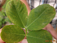 癥狀:主要為害花生葉片,初為褪綠小點,后擴展成近圓形或不規(guī)則形小斑,病斑較黑斑病大而色淺,葉正面呈暗褐或茶褐色,背面呈褐或黃褐色,病斑周圍有亮黃色暈圈。濕度大進病斑上可見灰褐色粉狀霉層,即病菌分生孢子梗和分生孢子。葉柄和莖稈染病 病斑長橢圓形,暗褐色。