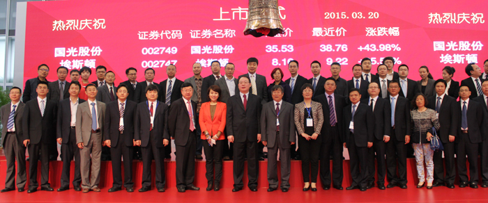 2015年3月20日上午,四川國光農(nóng)化股份有限公司上市儀式在深圳證券交易所隆重舉行。公司董事長顏昌緒,資陽市委書記、市人大常委會(huì)主任周喜安、農(nóng)業(yè)部藥檢所總農(nóng)藝師季穎、中國農(nóng)藥工業(yè)協(xié)會(huì)會(huì)長孫叔寶、中共資陽市委常委郎寬、資陽市人民政府副市長毛紹百、簡陽市人民政府市長趙春淦等政府主要領(lǐng)導(dǎo)及公司董事、監(jiān)事、高管出席了上市儀式。