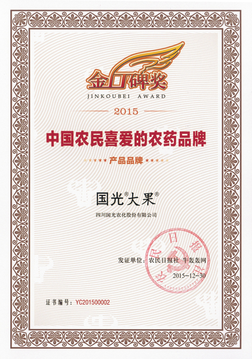 “2015中國(guó)農(nóng)民喜愛(ài)的農(nóng)藥品牌”大型公益調(diào)查活動(dòng)在2015年10月22日啟動(dòng),通過(guò)農(nóng)民日?qǐng)?bào)等機(jī)構(gòu)調(diào)查,國(guó)光“大果”榮獲2015中國(guó)農(nóng)民喜愛(ài)的農(nóng)藥品牌稱號(hào)。