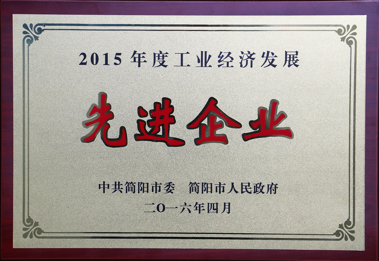 四川國(guó)光榮獲簡(jiǎn)陽市2015年度工業(yè)經(jīng)濟(jì)發(fā)展先進(jìn)企業(yè)榮譽(yù)
