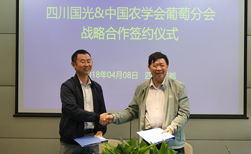 2018年4月8日,中國農(nóng)學(xué)會葡萄分會會長劉俊、秘書長張鶴蒞臨國光,與國光總經(jīng)理顏亞奇就葡萄產(chǎn)業(yè)現(xiàn)狀與種植技術(shù)變革進行了交流,雙方在友好協(xié)商、互相促進的前提下簽署了戰(zhàn)略合作協(xié)議,國光有幸成為了中國農(nóng)學(xué)會葡萄分會第一家戰(zhàn)略合作單位。