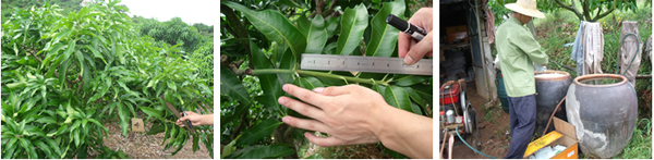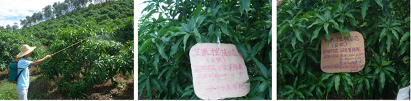 海南三亞福田公司種植戶李伯真18889889828,在2010年6月4日,使用15%國光多效唑可濕性粉劑對金煌芒、澳芒、貴妃芒(樹冠直徑3.5米,樹直徑14cm,土埋60g15%國光多效唑可濕性粉劑;樹冠直徑4.5米,樹直徑14cm,土埋15%國光多效唑可濕性粉劑80g)進(jìn)行土埋處理。后期表現(xiàn)效果:控梢穩(wěn)定,不“沖梢”;葉片濃綠加厚;枝梢生長短壯。圖為福田公司果園。