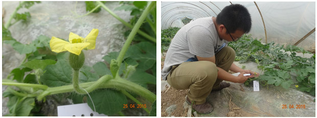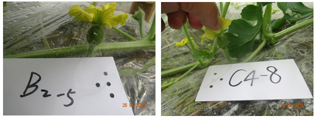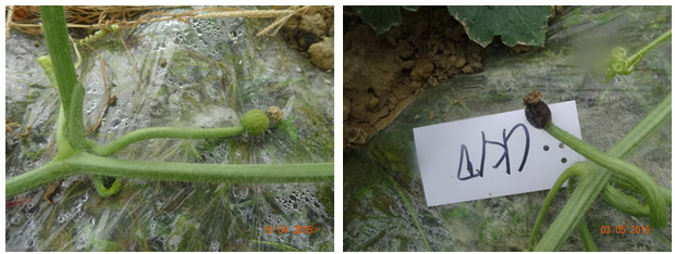 7、使用調(diào)節(jié)劑。在雌花開(kāi)放當(dāng)天或前一天,使用0.1%氯吡脲噴瓜胎,噴施時(shí)要均勻,噴正反兩面。一般在溫度低于18度使用0.1%氯吡脲10ml兌水1.5kg左右噴瓜胎,溫度在18-24度使用0.1%氯吡脲10ml兌水1.5-2kg,溫度25-30度使用0.1%氯吡脲10ml兌水1.5-3kg噴瓜胎可促進(jìn)座瓜,提高座瓜率。