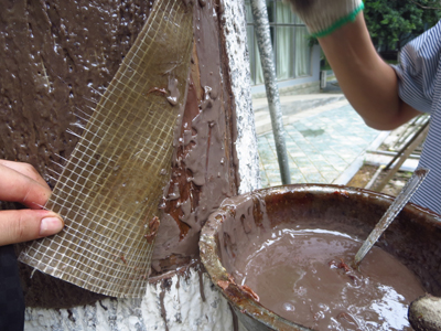 4、用剪刀剪下一塊與樹洞洞口大小一致的鐵皮(圖4)及制作好的仿真樹皮,將國光仿真樹皮專用膠及顏料調(diào)勻,涂抹在仿真樹皮背面后,將仿真樹皮粘貼在剪好的鐵皮上(圖5);