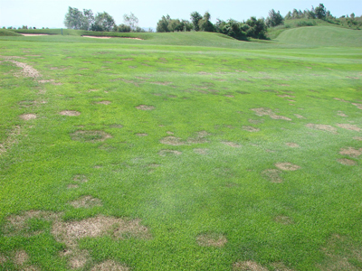 夏季斑是典型的根部病害,根系先感病,則植株不長,導(dǎo)致感病區(qū)出現(xiàn)凹陷的草圈,并逐漸枯死。