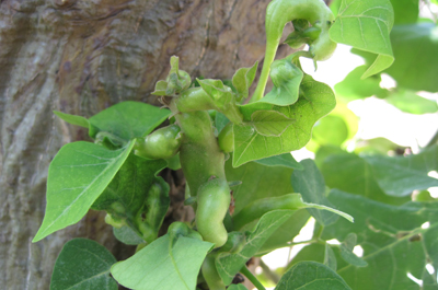 刺桐姬小蜂專一危害刺桐屬植物,該蟲生殖能力很強(qiáng),通常一旦出現(xiàn)輕微感染,短時間內(nèi)便會擴(kuò)散到全株。刺桐姬小蜂將卵產(chǎn)于刺桐嫩葉和葉柄組織內(nèi), 幼蟲在植物組織內(nèi)生長發(fā)育。由于植物組織受到幼蟲唾液分泌物刺激而增生, 呈水泡狀膨大, 并在葉片背面和葉柄上形成瘤狀蟲癭。蟲癭很快蔓延到全株, 致使全株葉片組織膨大,發(fā)展形成畸形、卷曲的病葉,嚴(yán)重影響整體景觀效映。幼蟲在蟲癭內(nèi)化蛹, 羽化的成蟲從蟲癭的羽化孔飛出。姬小蜂除了造成蟲癭, 使枝葉膨大、扭曲變形, 降低刺桐的觀賞價值外, 還會使形成蟲癭的枝、葉和旁邊的嫩枝、嫩芽枯死,葉片脫落。新發(fā)的葉片、嫩枝不斷受到感染, 無法長出健康的枝葉進(jìn)行光合作用,到后期直接造成刺桐樹死亡。